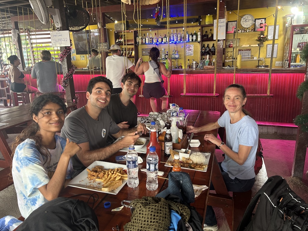 Back at the resort, Rajiv and Kiran discovered sizeable sunburns from the snorkeling adventure. Erica had been well covered, and Pori and I were unfazed. The evening ended quietly – grocery shopping, cooking together, and enjoying one of Kiran’s delicious meals, capped with local ice cream treats. The occasional rain came and went through the night, typical of Belize’s “dry season,” we didn’t think much of it.